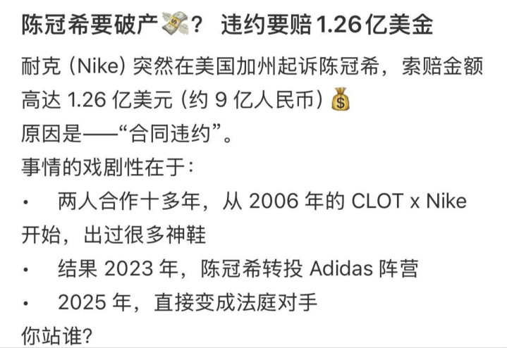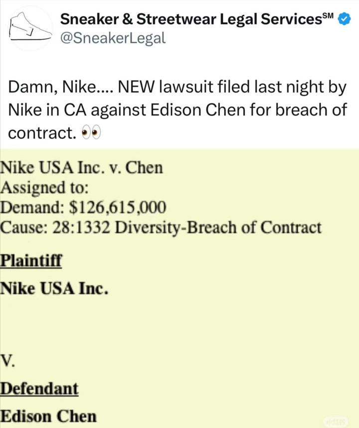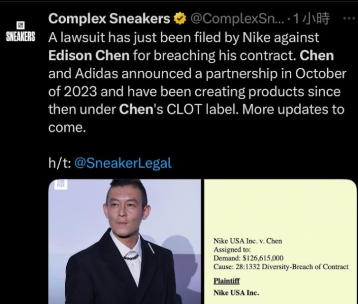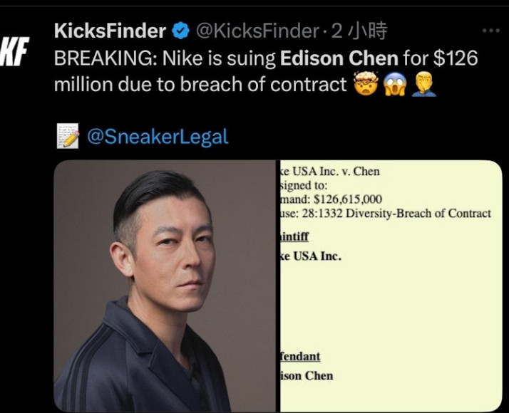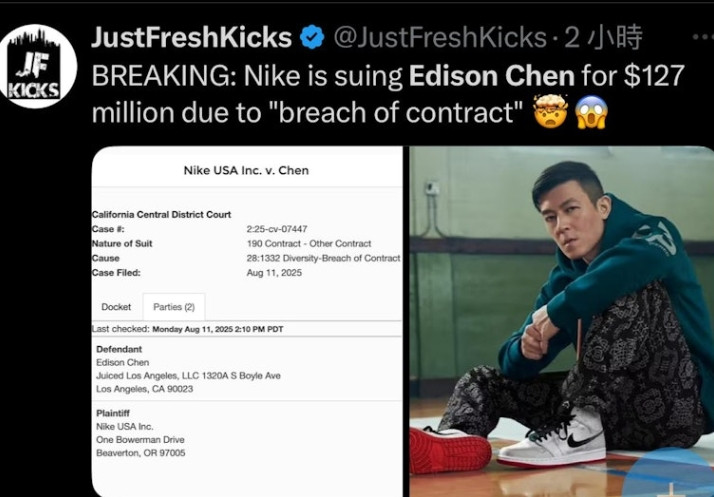 8月12日深夜,有消息指艺人陈冠希(Edison)遭运动品牌Nike控告“违反合作协议”,索赔1.26亿美元(约合9亿元人民币)。