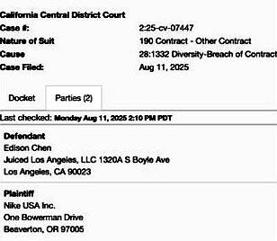 公开的案件资料显示:美国Nike公司在8月11日向美国加州中央地方法院提起诉讼,理据是违反合作协议,案件编号2:25-cv-07447,索赔金额是126,615,000美元。